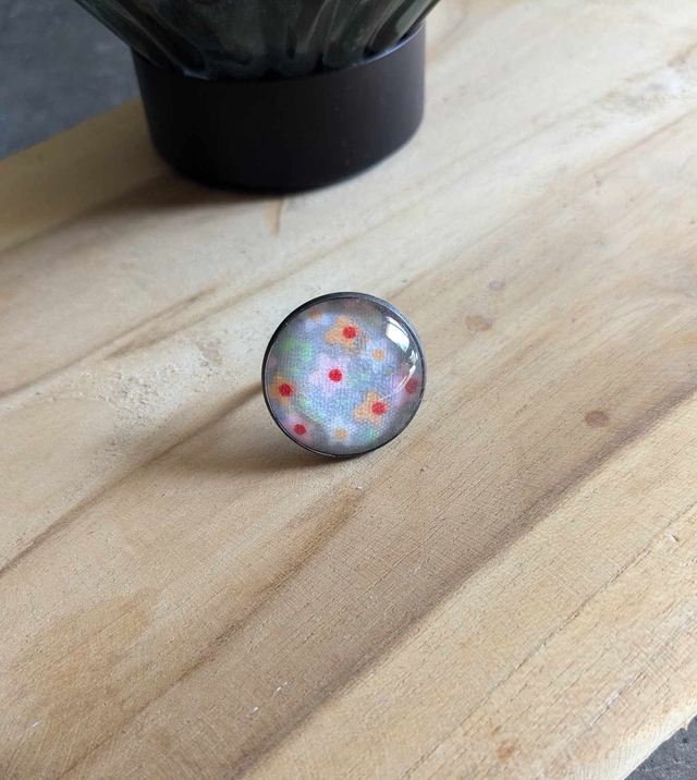 Bague ajustable couleur argent avec cabochon en verre et tissu.